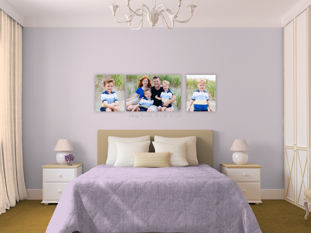 I have a new and exciting program to show you that I am now using during your in person ordering session. I am able to take the images from your portrait session and project them onto a wall in different groupings. This way you can see how an 8×10 isn’t big enough to go over your mantel of your fireplace. Do you need ideas on how to arrange a grouping of images on a wall over your couch or bed? I can even show you how your image would look in a nursery. The other nice thing is I can take a picture of your wall and then place the groupings right on that wall so you can visualize it in real time. I will give you ideas for wall display designs free and you don’t even need to hire a decorator. Here are some examples of some of the room pictures we can use.